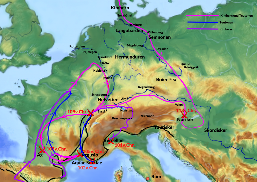 Um 120 v. Chr. führte ein Fürst der Kimbern, den sie später Boiorix nannten, seinen Stamm gemeinsam mit den Teutonen aus ihrem ursprünglichen Siedlungsgebiet an der Nordsee nach Süden. Sie suchten neues Land, denn die alten Heimatregionen boten keine Zukunft mehr. Tacitus berichtet ein Jahrhundert später: